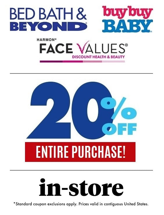 - Offer excludes the following: A Pea in the Pod®, Alessi, Amazon, Arthur Court, Baby Tula, Baby Brezza®, Baby Jogger™, Babyletto™, Babymel™, Baby’s Dream Furniture, BABYZEN™,BÉABA®, Bloom®, BOB@, Braava Jet, Breville®, Brookstone®, Bugaboo, Bumbleride™, clek®, Coravin, CYBEX, DaVinci™, DKNY, doona, Dyson, Ergobaby™, Fitbit™, Foundations®, franklin & ben™, Global Cutlery, Google, HALO® Bassinest™, , Inglesina®, , kate spade, Kenneth Cole Reaction Home, KitchenAid® PROLINE, Kosta Boda, Le Creuset®, Lladró®, Magnolia Home, Maxi-Cosi®, Miele, Million Dollar Baby Classic™, Monique Lhuillier, Motherhood Maternity®, Mountain Buggy®, Nambe®, Naturepedic, Nautica®, Nespresso, Nest, Nursery Works™, Orrefors, Peg Pérego, Petunia Pickle Bottom®, Phil & Teds®, Philips Hue, Quinny®, Riedel, Ring,Romero Britto™, Roomba 800 & 900 Series Vacuums, Shun, Southern Tide, Star Wars™ Sphero BB8™, Star Wars™ Battle Quads, Stokke®, storksak®, Svan®, Swarovski, Swash, Swiss Diamond, Thule®, Under Armour®, UPPAbaby®, Uttermost, Vera Bradley®, Vera Wang, Victorinox Luggage, Vitamix®, Waterford®, Wusthof®, diapers, wipes, formula, baby food, or portrait studio services. Alcoholic beverages excluded where required by law. This offer does not apply to alcoholic beverages purchased in New Jersey. Additional online items excluded: Beautyrest Black, Beautyrest Platinum Hybrid, Blaze, Bosch Stand Mixers, Carolee George Kovacs, Hanover Grills, iComfort®, iSeries®, Karastan, Litter Robot, Louisiana Grills, Luminox, Watches, Metropolitan, Minka Aire, Minka Lavery, Napolean Grills, Nutrimill, One Fast Cat, Pit Boss, Quoizel, Saber®, simplehuman sensor mirror pro,Stanley Furniture, Stone & Leigh by Stanley Furniture, The Uttermost Co, Tempur-Pedic mattresses and bases or power tools. See Bed Bath and Beyond exclusions.