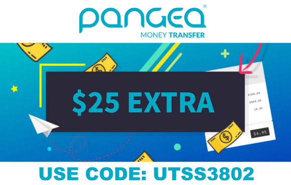 Pangea Money Transfer will give you $25 off your first transfer in addition to a competitive exchange rate!